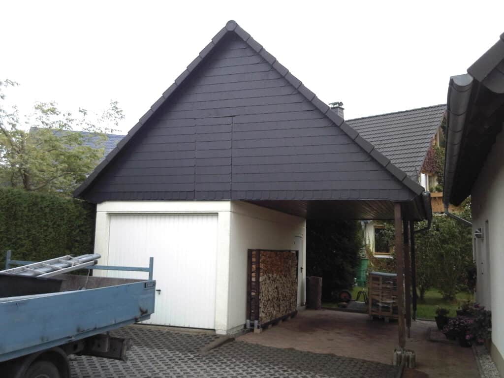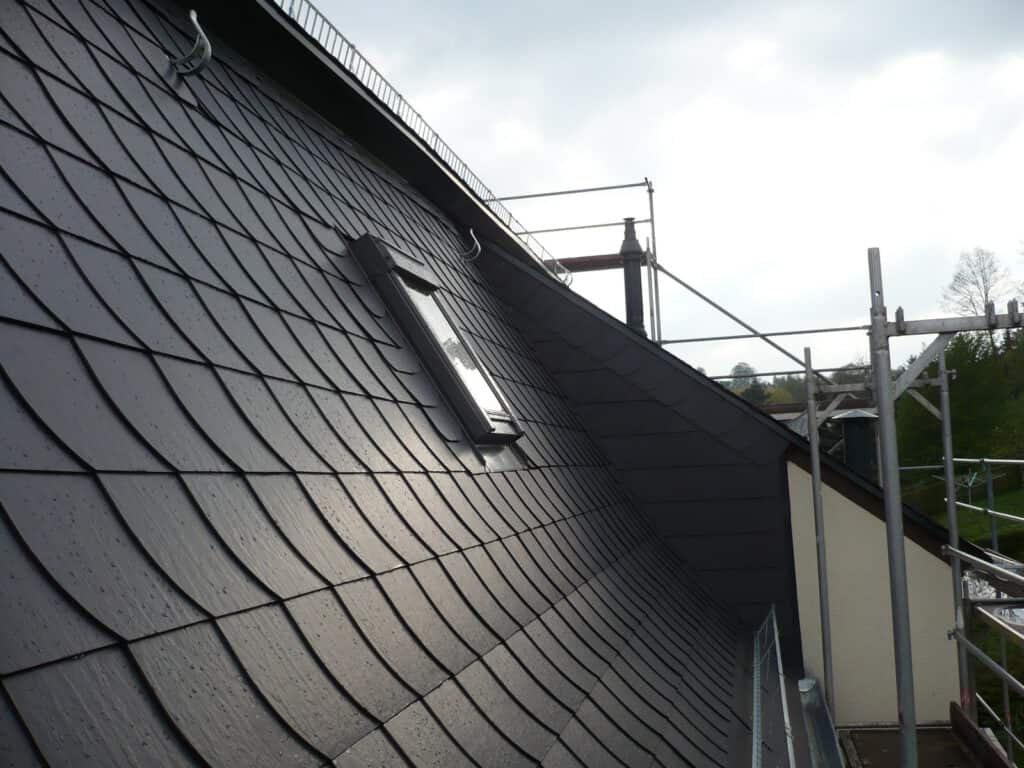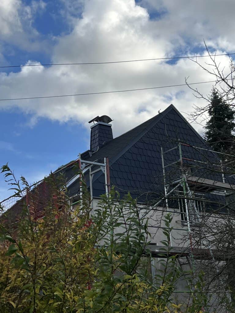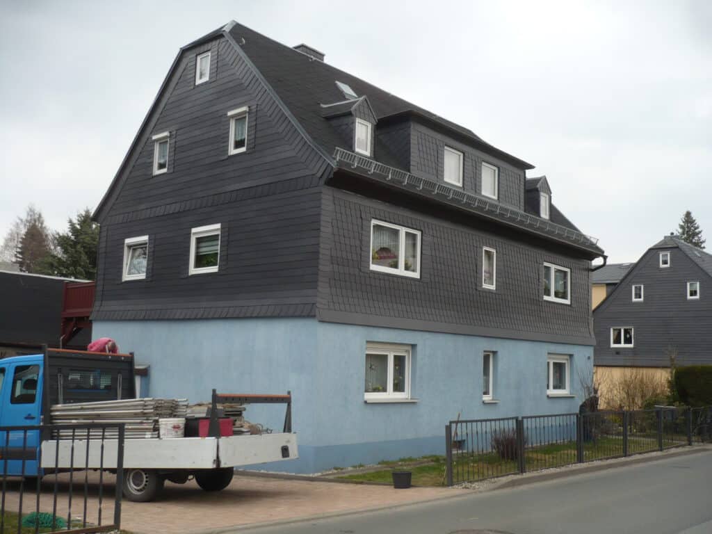 Oktober 2022 Olbernhau - Blumenau: Neue Dacheindeckung mit Bitumenschindeln. Der Schornstein und die Fassade wurden neu verkleidet.